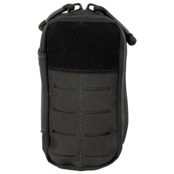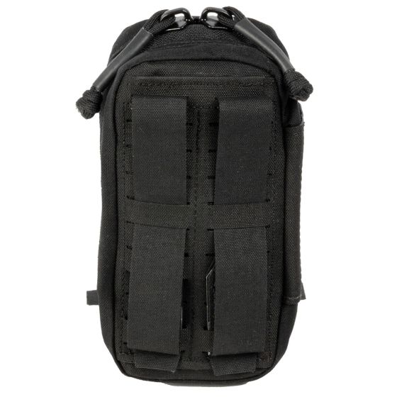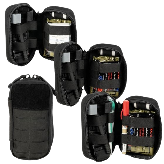 This Individual First Aid Kit's super compact, rugged nylon bag opens via 550 cord zipper pulls from the side in a clam shell configuration utilizing (2) two main sleeves that open on both ends for easy access and features multiple elastic loops for secure gear organization. The bag’s exterior includes a MOLLE backing for mounting in the standard vertical position as well as a 3 inch internal sleeve for accommodating horizontal attachment to your duty belt. The vertical mount can be set to open left-to-right or right-to-left based on shooter preference, while the horizontal mount on a belt allows opening directly to your C-A-T® tourniquet. Also included are a loop patch on front of the bag for custom user labeling and (3) three MOLLE strips on the front, and (2) two MOLLE strips on the spine's edge to attach additional gear such as TQ/Holders, tactical lights, or knives (sold separately) if needed.